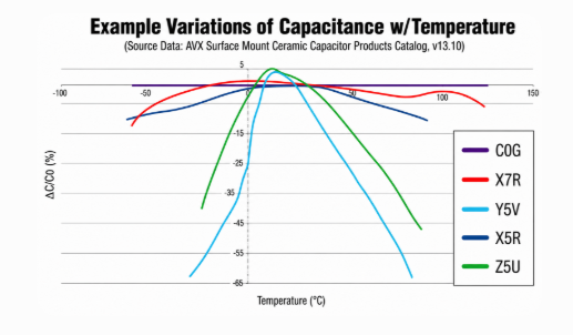 Figure 2. Capacitance vs Temperature: Stable C0G vs Varying Dielectrics